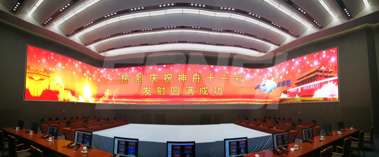 這塊大屏(P1.47,200㎡)呈U字形安裝在控製中心大廳。2016年10月17日,神(shén)舟十一(yī)號載(zǎi)人飛船發射;同(tóng)年11月9日(rì),這塊高清屏高質量地完成了全程顯示了國家領(lǐng)導人與神(shén)舟十一號航天員天地通話(huà)實況,向世人(rén)展示了中國航天事業的(de)驕傲成果。