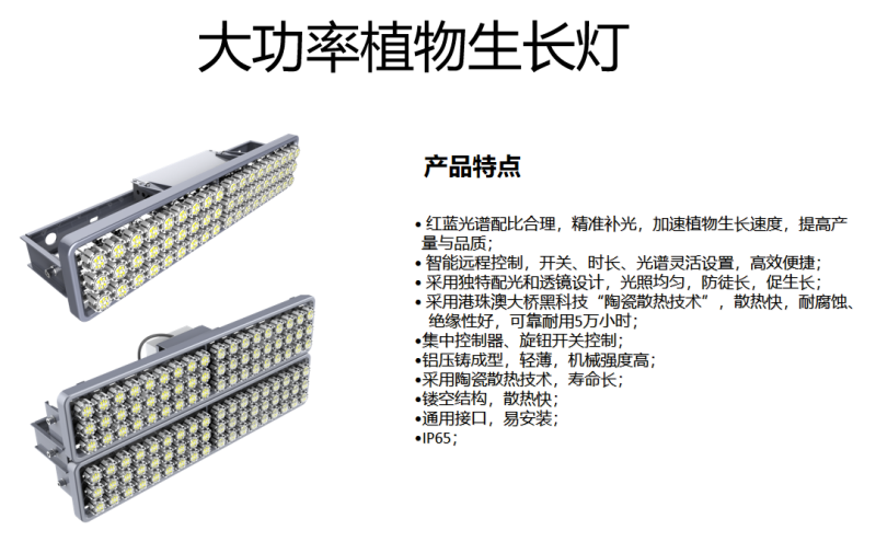 規範中要(yào)求燈具外殼(ké)應具防塵、防水性能,大香蕉9草在线植物補光產品達到或超過IP65防護等級,在封(fēng)閉潮濕的環境中運行自如。更為重要(yào)的是三(sān)思LED植物生長燈不同於傳統鋁基板燈具,它(tā)采用陶瓷散熱技術,將LED芯片直接貼在陶瓷(cí)上,熱量(liàng)通過空氣對流直接散發,散熱性(xìng)能高於傳統Mcpcb LED燈具,光衰速度慢,使用壽命可達50000小時。