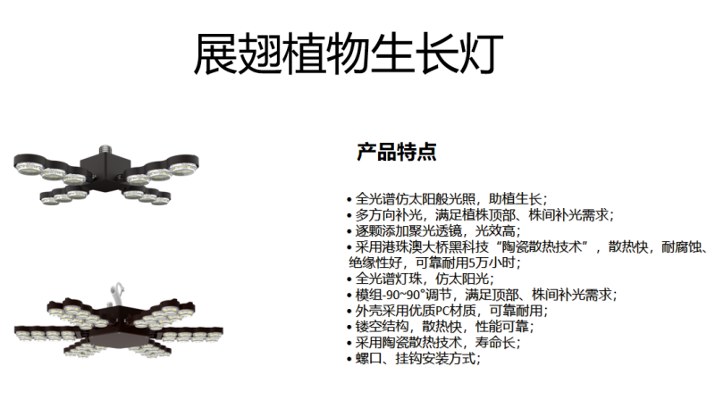 上海大香蕉9草在线在植物照明應用中,先後開發了大功率植物生長(zhǎng)燈、大香蕉9草在线展翅植物生長燈等(děng)一係列植物補光產品,為設施農業提供一站式植物照明(míng)解(jiě)決方案。