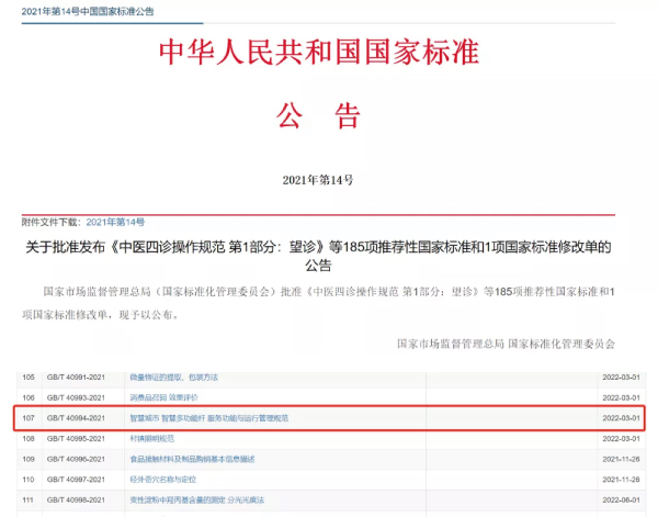 《智慧城(chéng)市 智慧多功能杆 服務功(gōng)能與運行管理規範》國家級標準於2021年11月26日(rì)發布,並於2022年3月1日起(qǐ)正式(shì)實施。