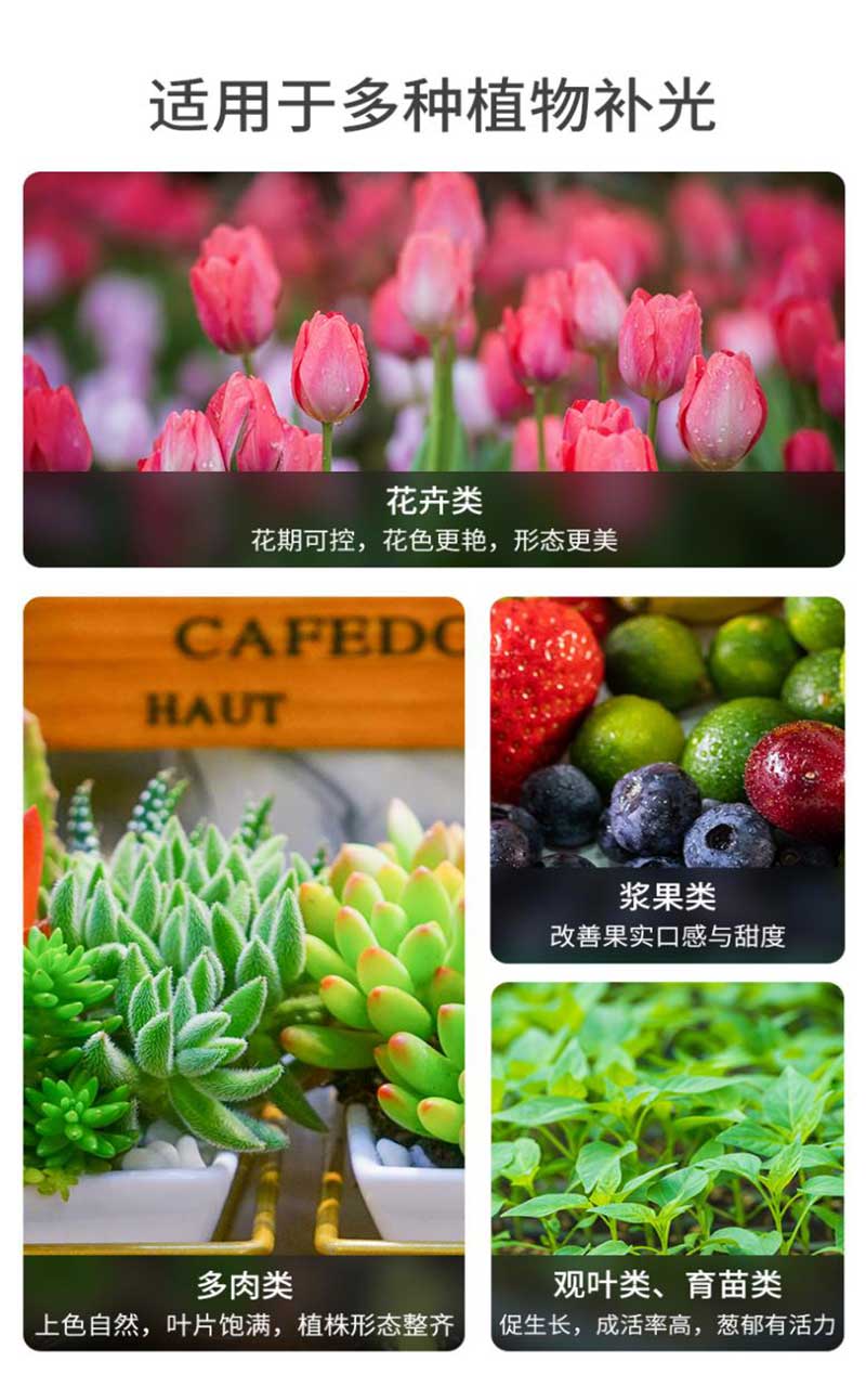 紅藍光(guāng)譜植物生長燈光譜包含紅光光譜和藍光光(guāng)譜,而全光譜植物生長燈則(zé)是模擬太陽光,光譜接近太陽光,包(bāo)含赤、橙、黃、綠、青、藍(lán)、紫不同光(guāng)譜,適用於多種植物補光(guāng),