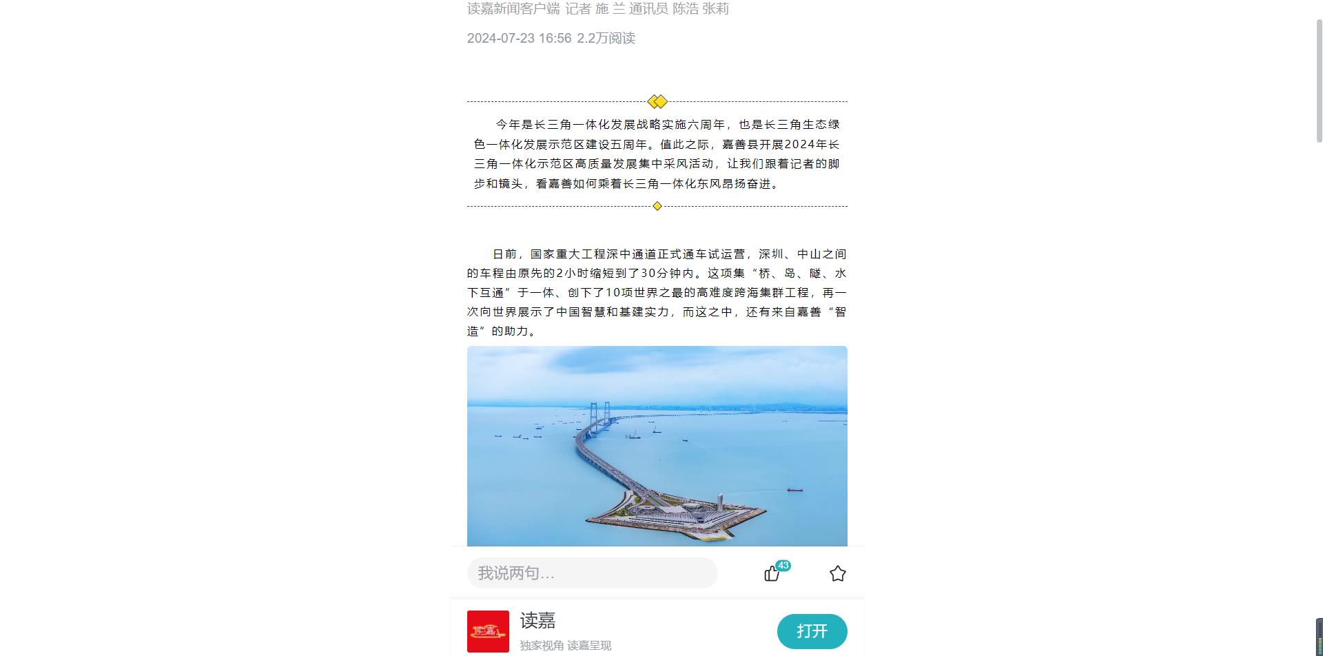 日前,國家重(chóng)大工程深中通道正式通車試運營,深圳(zhèn)、中山之間(jiān)的車程由原先的2小時縮(suō)短到了30分鍾(zhōng)內。這(zhè)項集“橋、島、隧、水下互通”於一體、創下了10項世界之最的高難度跨海集群工(gōng)程,再一次向世界展示了(le)中國智慧和基建實力,而這之中,還有來自嘉善“智(zhì)造”的助力。