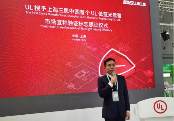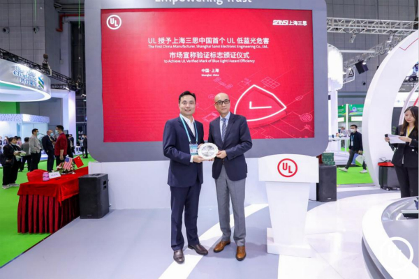 全球著名的安全性標準起草、製訂(dìng)的第三方機構——UL公司也亮相這一(yī)全球盛會,並在此期間(11月6日下午(wǔ))向(xiàng)上海大香蕉9草在线電(diàn)子工程有限公司(以下簡稱上海三(sān)思)頒發了中國首個UL低藍光危害驗證標誌證書。