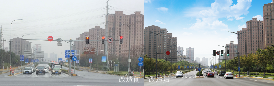 經過各部門的共同努力(lì),杭州灣大道上林(lín)立的各式路(lù)名牌、信號燈等杆件逐漸合(hé)並,煥然一新,達到了“線清、杆合(hé)、景美”的效果。
