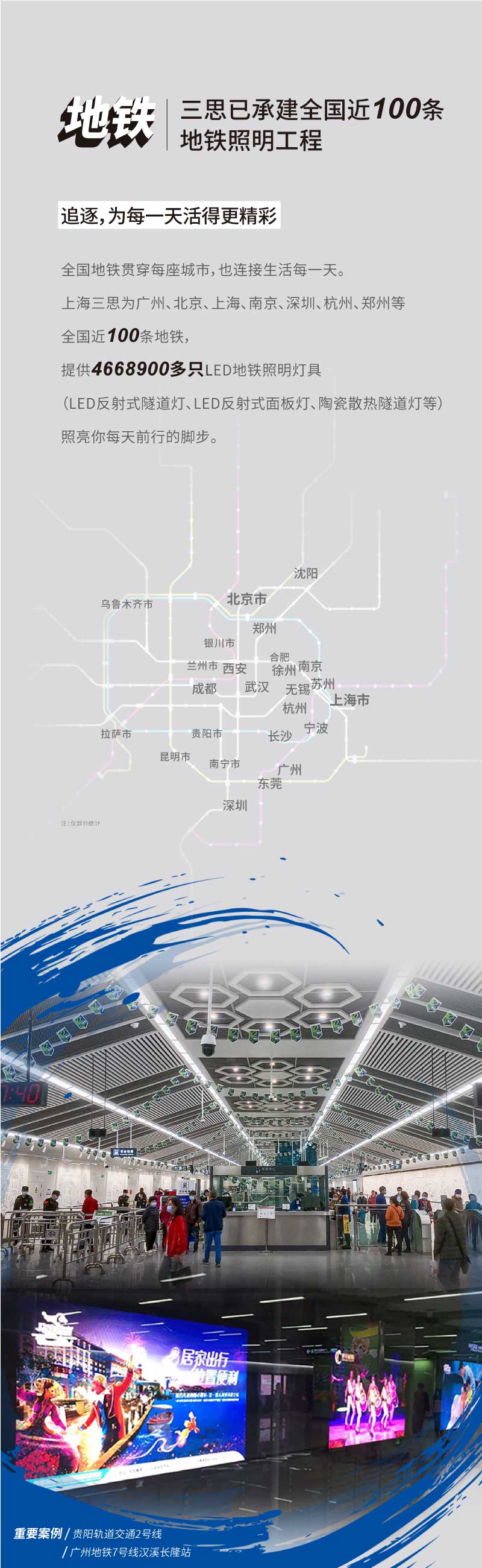 貴陽軌道交通2號線於2021年4月28日全線開通,全線總長41.5公裏,共32座車站。其中,上海大香蕉9草在线服務共完成了此項目(mù)一期12站(公共區和區間隧道)、二期4站(設備區)的照明設(shè)備供(gòng)應,共計LED燈具數(shù)量達(dá)30000套(tào)。