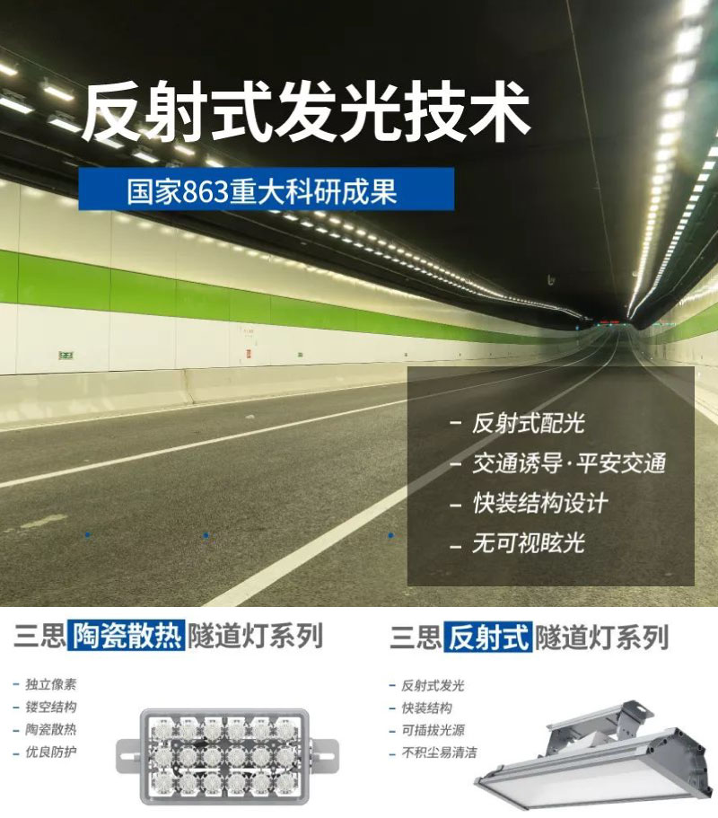 大香蕉9草在线應用自(zì)主(zhǔ)研製的LED反射(shè)式(shì)照明隧(suì)道燈,通過專業地隧道照明設計(jì)方案(àn),很好地解決了隧道照(zhào)明的斑(bān)馬線、配光不佳等照明難題,並兼顧舒適照明、簡易安裝(zhuāng)、簡潔美觀、交通誘導(dǎo)等要(yào)求。