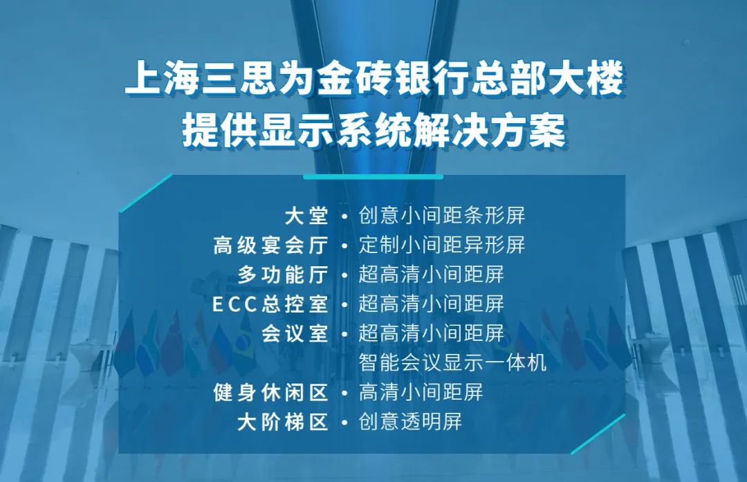 會議是日常工作運轉的重要方式(shì),一個更高效便捷的會議環境對(duì)金磚銀行(háng)至(zhì)關重要。上(shàng)海三(sān)思為總部大樓多(duō)層大(dà)小會議室提供高效、高品質(zhì)的會議顯示(shì)係統(tǒng)解(jiě)決方(fāng)案,涵蓋超高清小間距屏、智能高清顯示會議一體機。