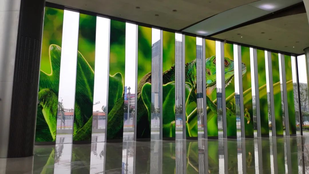 在大堂(táng)前台,嵌入式超高清小間條形屏儼然建築飾(shì)麵的一(yī)部(bù)分,融為一體。