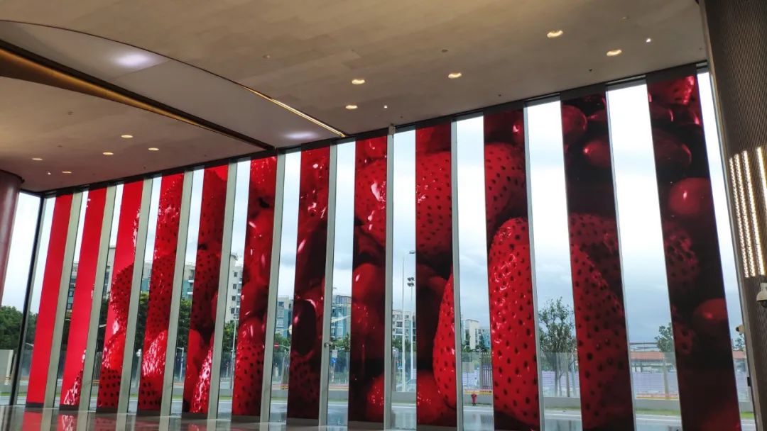 走進金磚銀行大樓,第一眼便可見大落地窗前一(yī)排屏(píng)幕構成的"柵欄(lán)"——13塊由上海大香蕉9草在线定(dìng)製的條形屏群組,形成一(yī)道靚麗的風景。