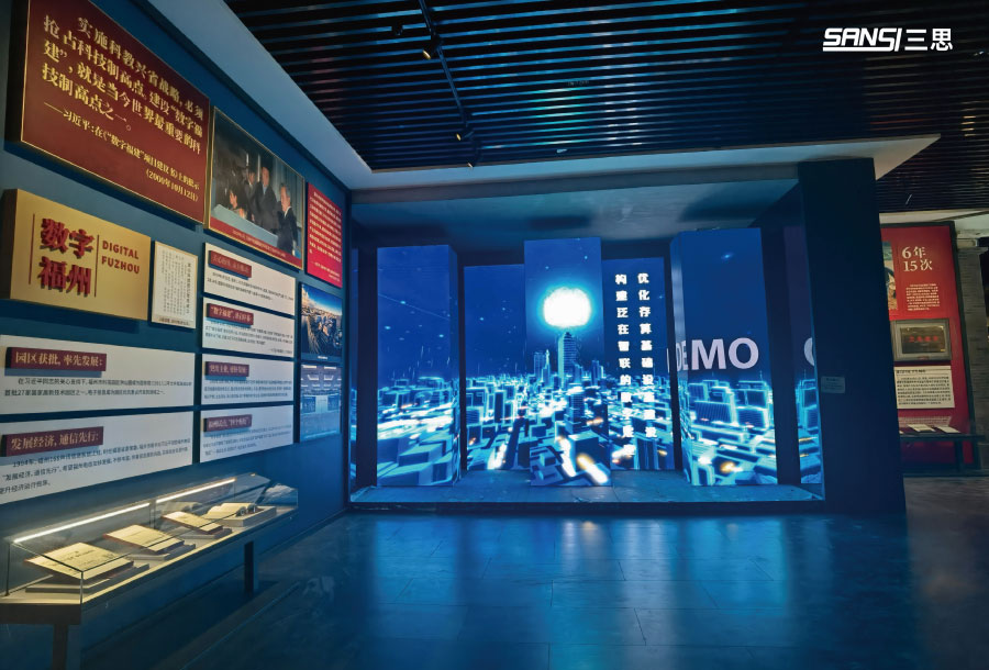 顯示屏(píng)將頂部、牆麵和地麵連為一體,視覺上形(xíng)成完整的(de)空間,視頻畫(huà)麵加上聲(shēng)光電技術的共同(tóng)作(zuò)用,滿足了沉浸(jìn)感的需求,向所有參觀者更生動地展現(xiàn)了福州的騰飛故事,激發參觀者對於福州曆史的求知欲,以身臨其境的體(tǐ)驗融入福州故事中(zhōng),形成強烈、有趣的互動。