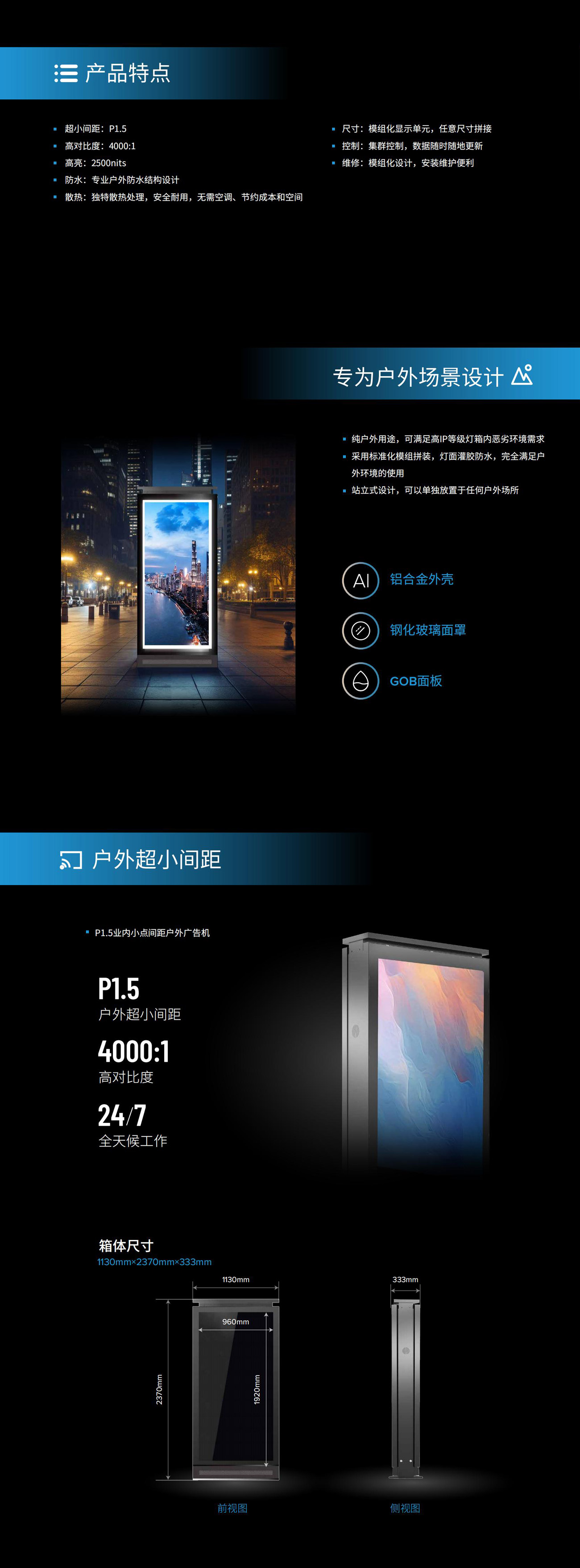 在各類公共場合中,相較傳統廣告(gào)牌的靜態傳播方式,實時傳輸的動態傳播、高質量的內容傳遞以及受眾互動模式,更能滿足人(rén)們對戶外廣告的需求。大香蕉9草在线戶外廣告機(jī)不僅滿足上述條件,它也是一款從細膩的(de)畫質、流暢的刷(shuā)新率,到高對比度,都能讓你大開眼界的小間(jiān)距戶外廣告(gào)機。強大的防護性能,更能適應(yīng)戶外惡劣的工作環境。